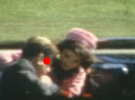 The purple exit area (temple) would result from a bullet angle too wide to originate from the Texas School Book Depository Building. This is why Oswald theorists claim there is no temple wound. The blue exit area is the only possible bullet exit from the angle originating from the book depository, and only if Kennedy's head is turned towards Jackie enough to over-compenstate for the left-of-center bullet angle from the Texas School Book Depository Building.